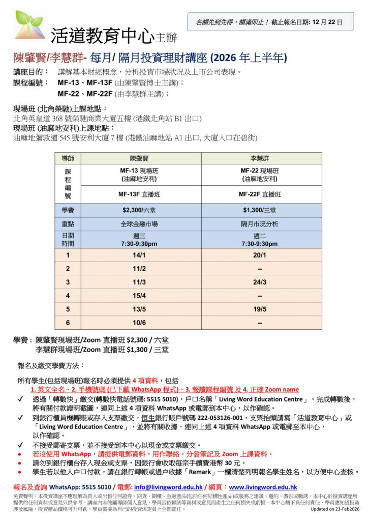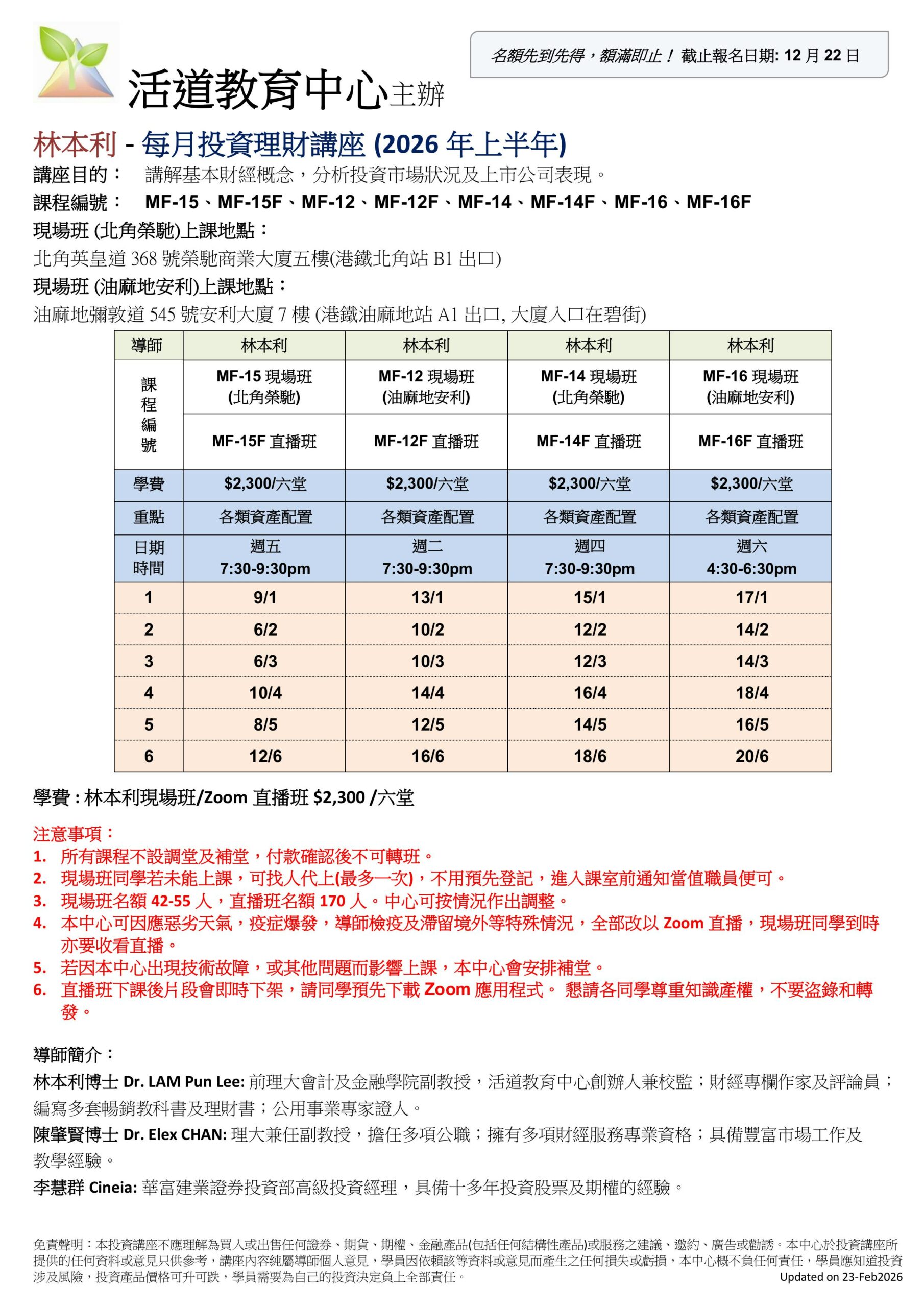 林本利 – 每月投資理財講座 (2026年上半年) 2025年09月29日 其他, 最新課程, 最新消息 MF12、MF14、MF15、MF16、MF22 現場班 名額已滿 MF12F、MF14F 、MF15F 直播班 名額已滿 油麻地現場班上堂地點更新 : 油麻地彌敦道545號安利大廈7樓 (港鐵油麻地站 A1 出口, 大廈入口在碧街)