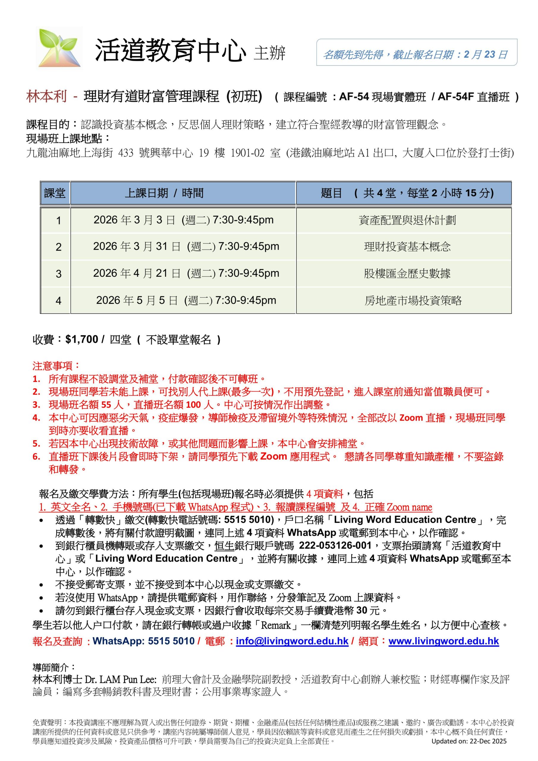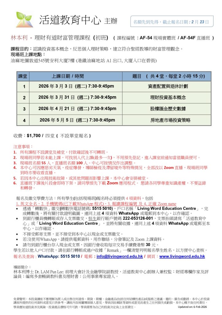 林本利 – 理財有道財富管理課程 (初班) ( 課程編號 : AF-54 現場實體班 / AF-54F 直播班 )