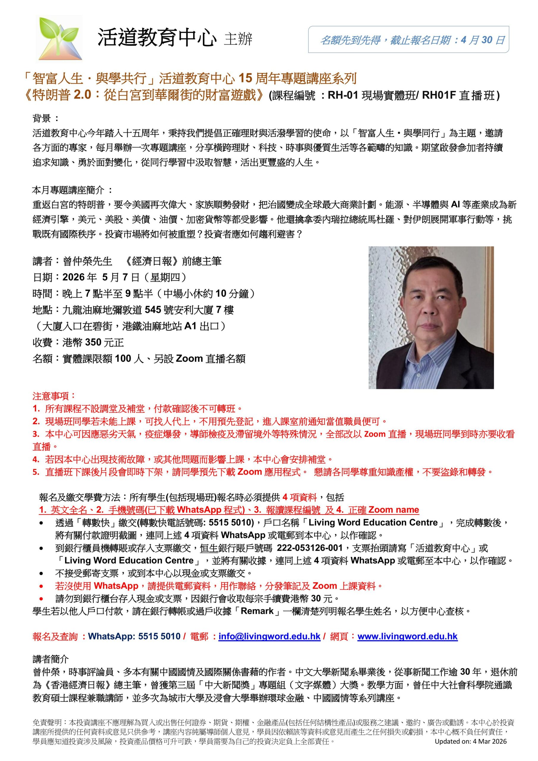 「智富人生.與學共行」活道教育中心15周年專題講座系列 《特朗普2.0:從白宮到華爾街的財富遊戲》(課程編號 : RH-01現場實體班/ RH01F直播班)